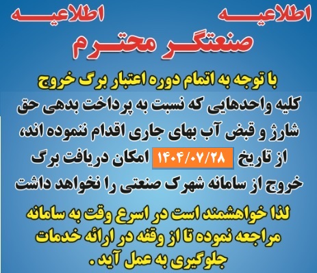 به گزارش روابط عمومی شرکت خدماتی شهرک صنعتی بزرگ شیراز، واحد امور مشترکین شارژ،آبفا و پرتال اینترنتی در اطلاعیه ای اعلام نمود: با توجه به اتمام دوره اعتبار برگ خروج ، از 28 مهرماه 1404 در صورت پرداخت ننمودن حق شارژ،آب بها و فاضلاب برگ خروج ها پرینت شده باطل و سامانه دریافت برگ خروج مسدود می گردد. لذا خواهشمند است در اسرع وقت به سامانه مراجعه نموده تا از وقفه در ارائه خدمات جلوگیری به عمل آید.