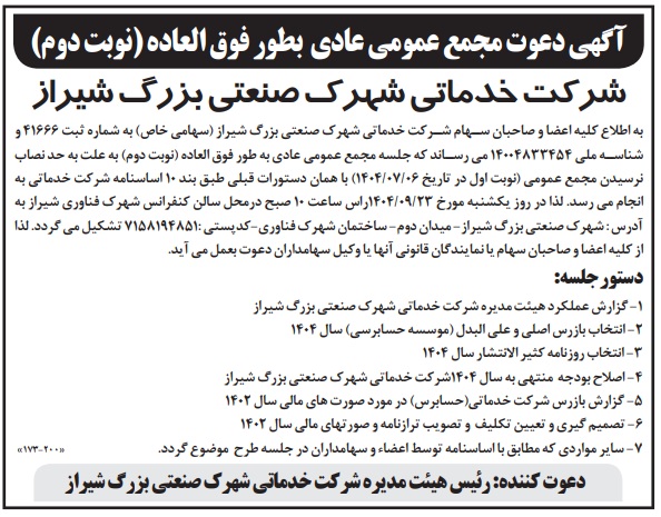 آگهی دعوت مجمع عمومی عادی بطور فوق العاده (نوبت دوم)شرکت خدماتی شهرک صنعتی بزرگ شیراز