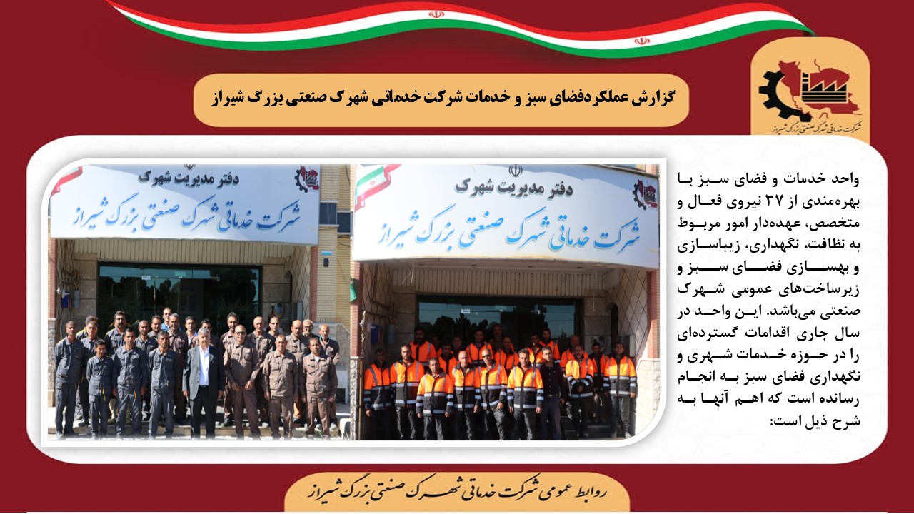 به گزارش روابط عمومی شرکت خدماتی شهرک صنعتی بزرگ شیراز، واحد خدمات و فضای سبز با بهرهمندی از ۳۷ نیروی فعال و متخصص، عهدهدار امور مربوط به نظافت، نگهداری، زیباسازی و بهسازی فضای سبز و زیرساختهای عمومی شهرک صنعتی میباشد. این واحد در سال جاری اقدامات گستردهای را در حوزه خدمات شهری و نگهداری فضای سبز به انجام رسانده است که اهم آنها به شرح ذیل است: